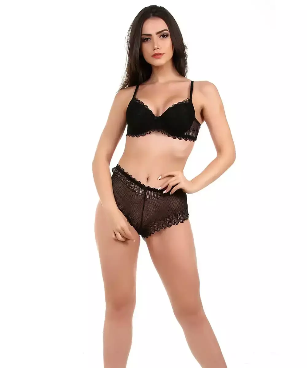 O Conjunto Charlote é puro charme! O sutiã com bojo é encapado com renda e acabamento em microfibra. O modelo possui alças reguláveis e fecho duplo nas costas. A calcinha caleçon confeccionada toda em renda é muito confortável e ao mesmo tempo possui esse charme de tiras entrelaçadas nas costas, que torna a peça exclusiva!